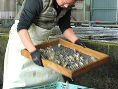 ![]() 水揚げされたあさりを機械を使い サイズ別に選別しています。 |